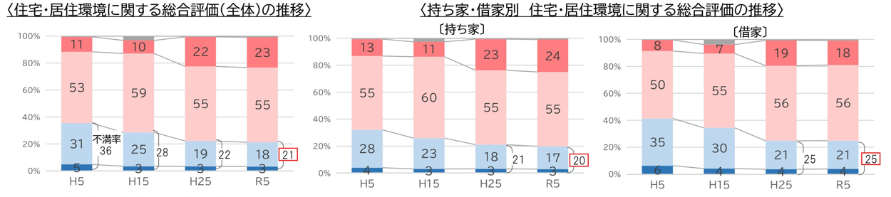 住宅・居住環境に関する総合評価は、全体でも、持ち家・借家別で見ても、10年前と比べておおむね横ばいで推移しています。住宅の不満率は引き続き低下した一方、居住環境の不満率は平成25年からの10年間では、不満率は微減しているものの、ほぼ横ばいで推移しています。