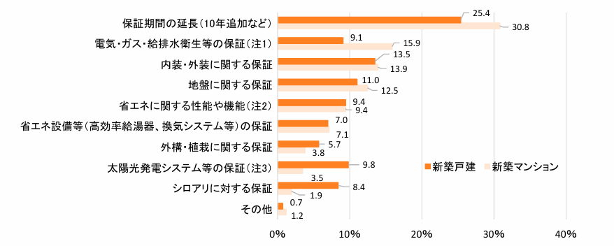 求める保証としては、「保証期間の延長」が25.4%で最多でした。次いで「内装・外装に関する保証」が13.5%、「地盤に関する保証」が11.0%、「太陽光発電システム等の保証」が9.8%と続きます。