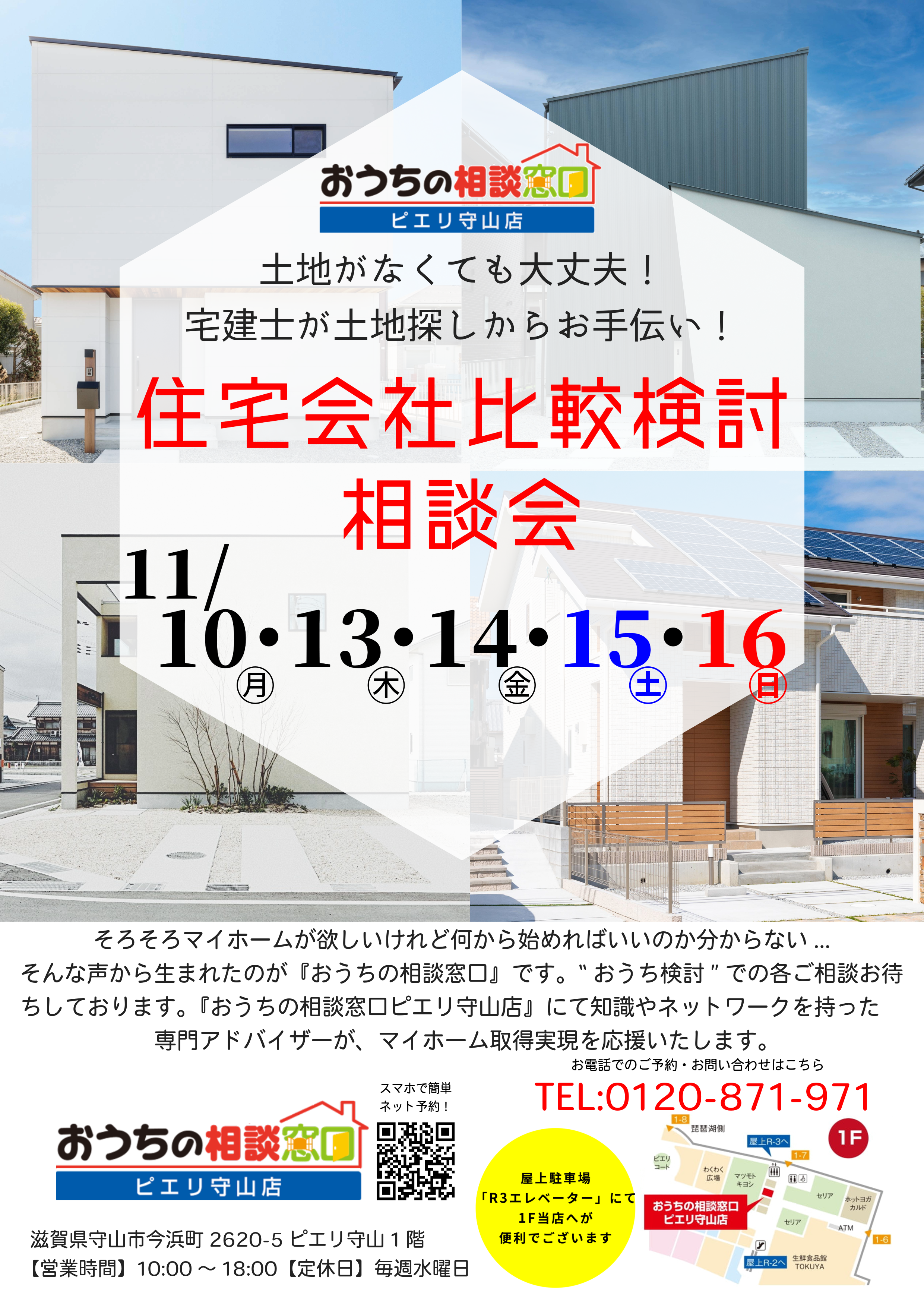 11/10(月)・13(木)・14(金)・15(土)・16(日)は『住宅会社比較検討相談会』を開催❢おうちの相談窓口ピエリ守山店♪