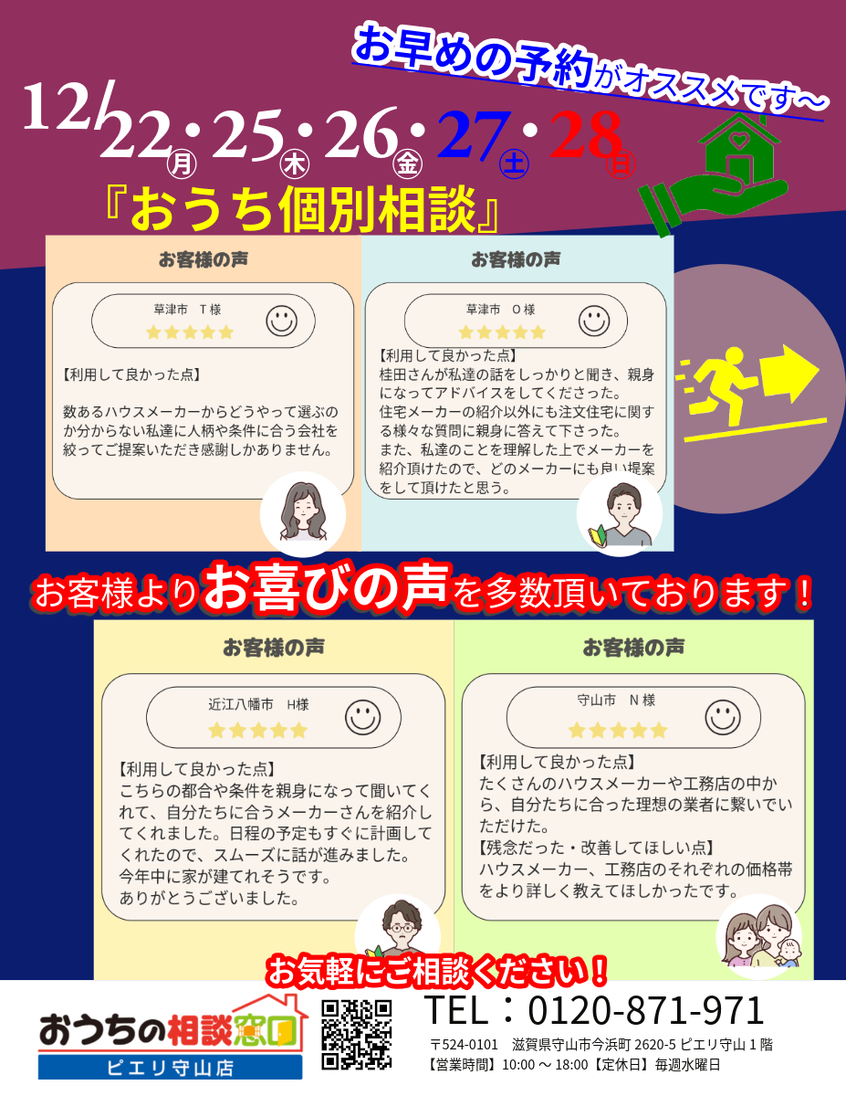 12/22(月)・25(木)・26(金)・27(土)・28(日)は『おうち個別相談』を開催いたします。