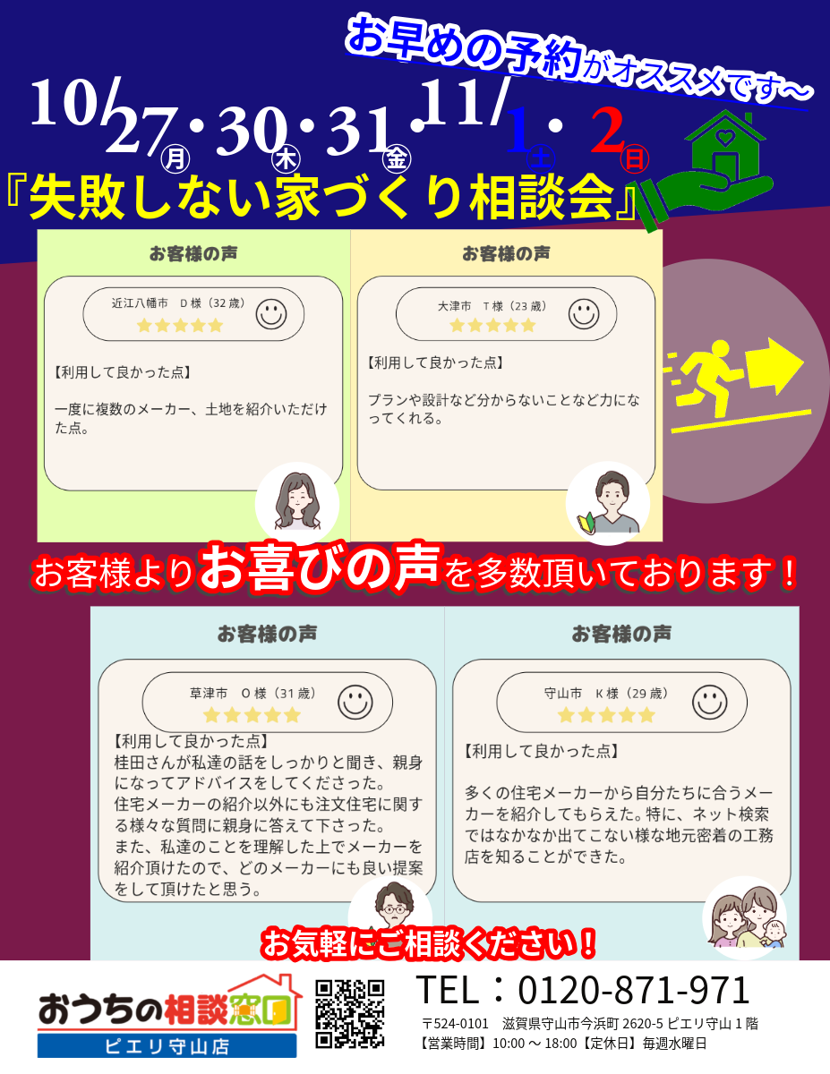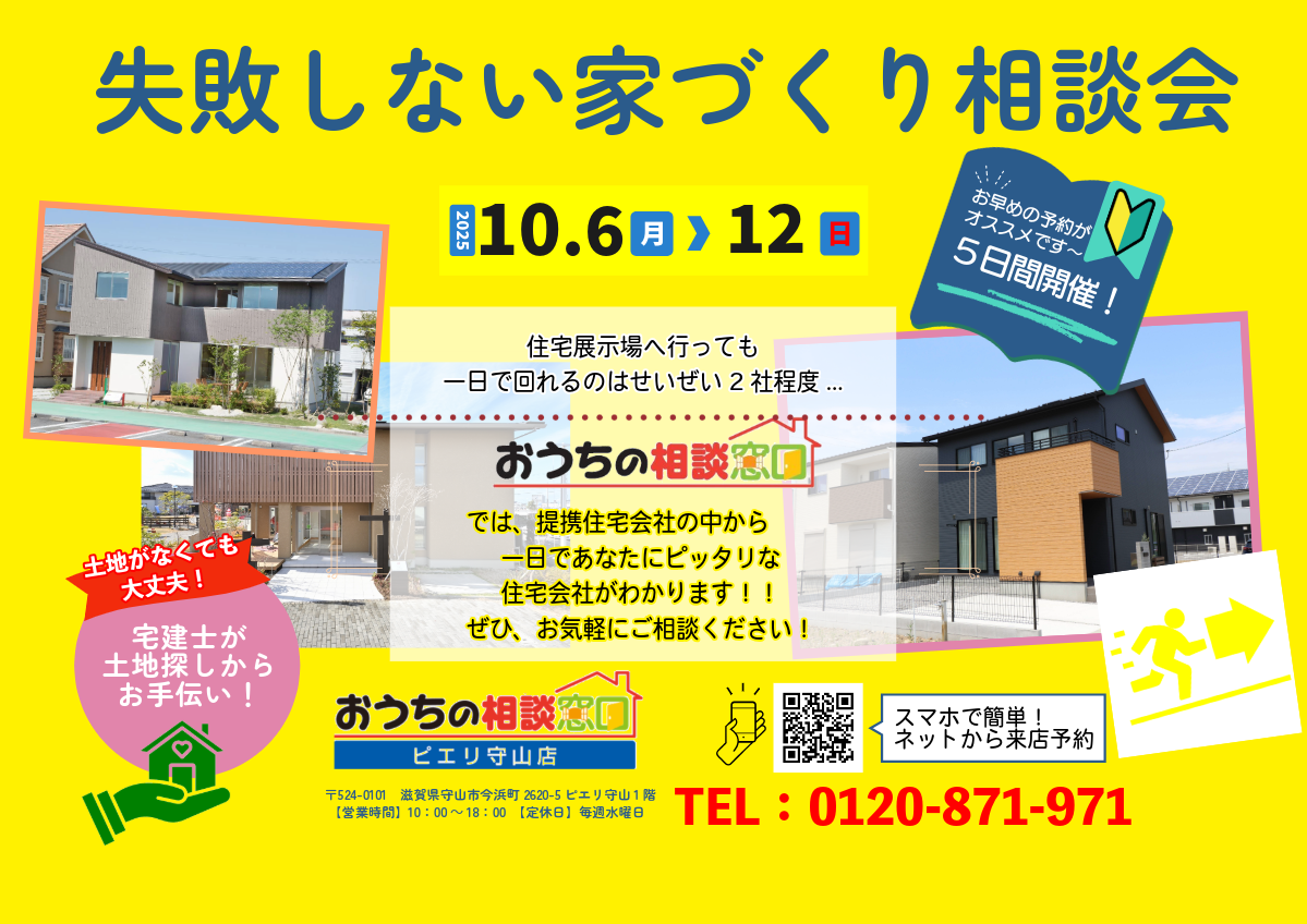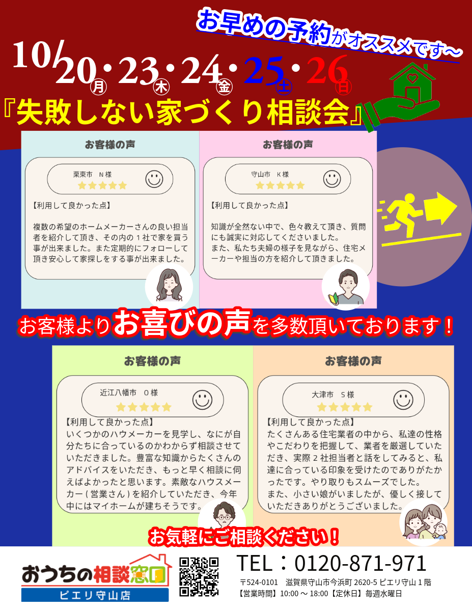 2025年10月13日(月) 家づくり相談会 10/20(月)・23(木)・24(金)・25(土)・26(日)は『失敗しない家づくり相談会』を開催❢おうちの相談窓口ピエリ守山店♪