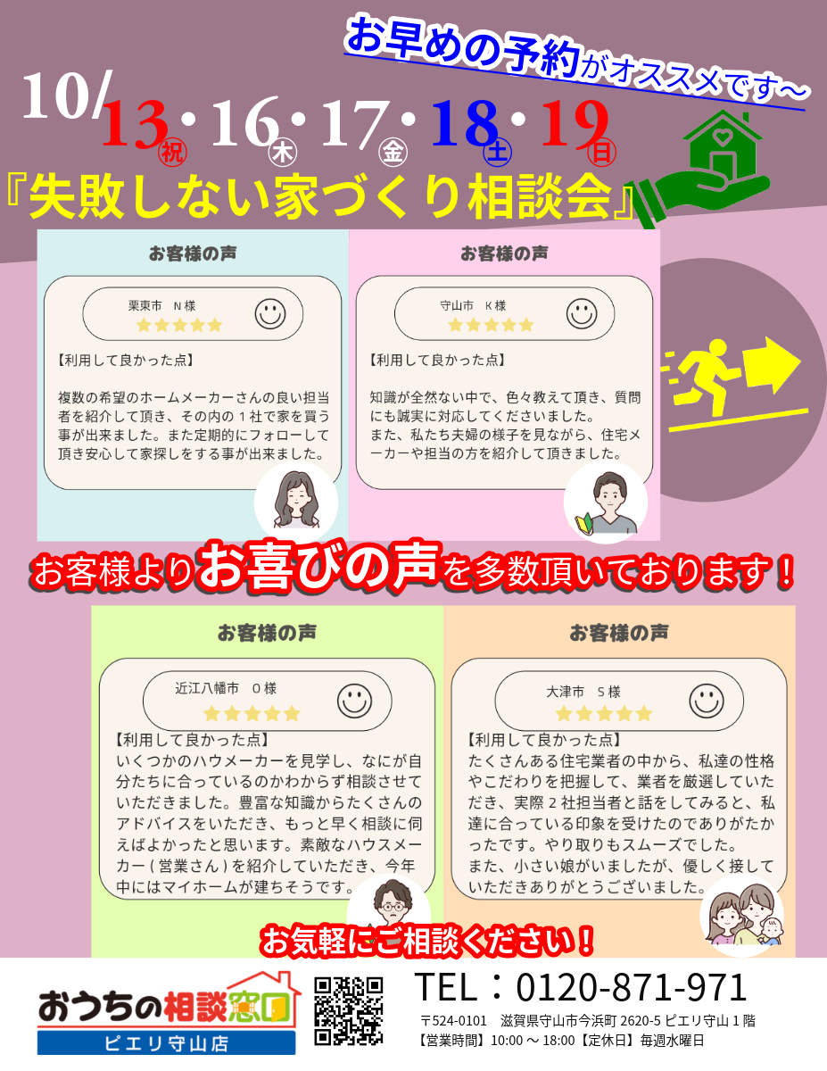 2025年10月06日(月) 家づくり相談会 10/13㊗・16(木)・17(金)・18(土)・19(日)は『失敗しない家づくり相談会』を開催❢おうちの相談窓口ピエリ守山店♪